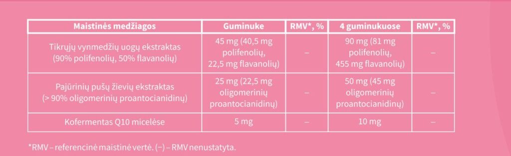 Tikrųjų vynmedžių uogų ekstraktas gali padėti palaikyti sveikas kraujagysles ir kapiliarų vientisumą, normalią ląstelių veiklą ir funkcijas.